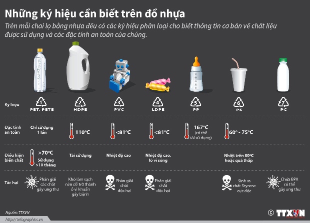 Dưới đáy mỗi hộp nhựa có các con số từ 1 – 7, mỗi con số khác nhau phản ánh 7 loại khác đồ nhựa khác nhau. Dựa vào những con số ấy, ta có thể biết được loại nào đựng được đồ ăn, loại nào tái chế, loại nào không để đảm bảo an toàn cho người sử dụng.